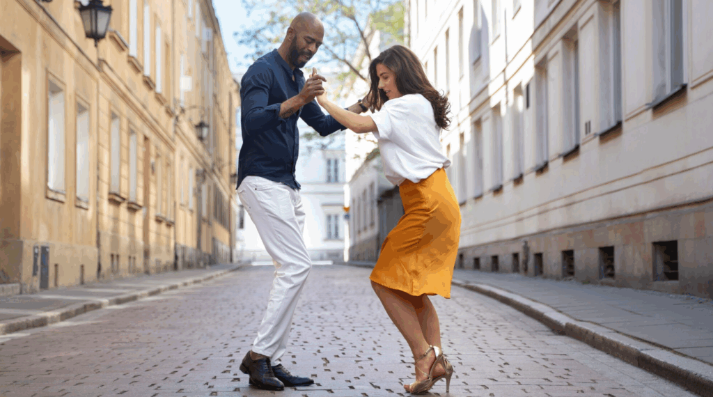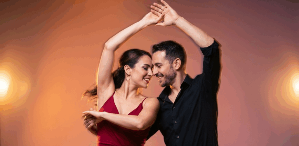 Bachata is a romantic and soulful dance that originated in the Dominican Republic. This dance is characterized by a simple step pattern with a distinctive hip sway, often accompanied by graceful turns and body rolls. The music, typically featuring guitar and percussion, creates a heartfelt, melodic rhythm that complements the dance’s expressive style.